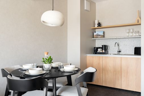 Das moderne Design fügt sich nahtlos mit natürlichen Materialien und warmen Tönen zusammen und kreiert eine Atmosphäre der Stille und Behaglichkeit.
